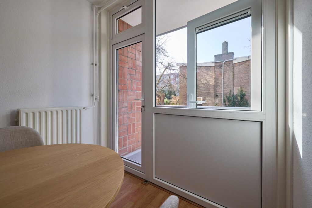 • Achtergevel voorzien van kunststof kozijnen (2024, via de VvE vernieuwd)