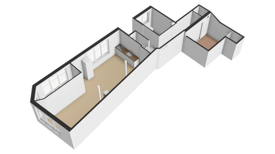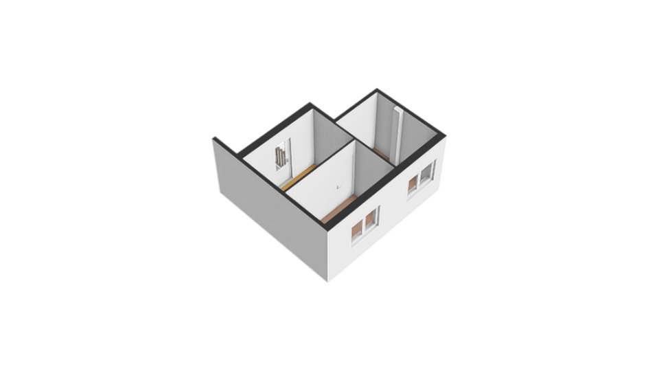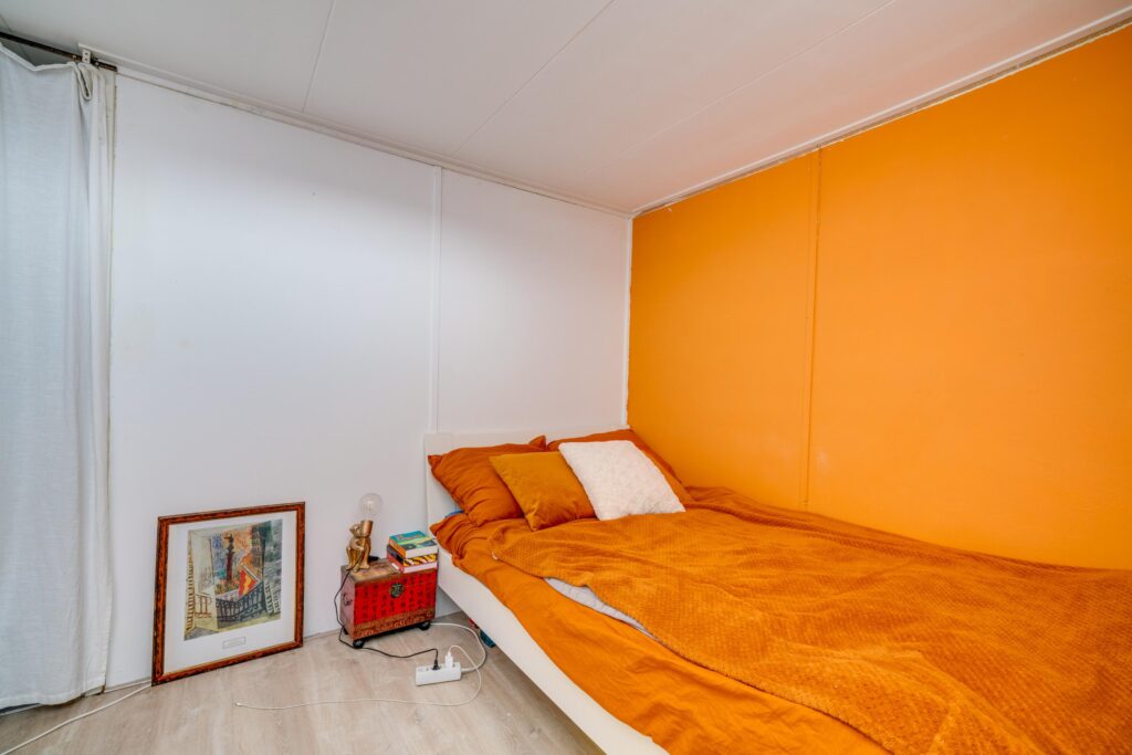 Entree, hal, doorzon woonkamer met open eenvoudige keuken en een toegang tot de tweede hal. Deze is voorzien van een inloopdouche, een ruimte voor de wasmachine en het toilet. Er zijn twee slaapkamer, waarvan één met uitbouwkast.