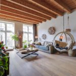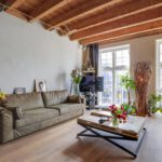 In het midden van de living, langs de wand bevindt zich de trapopgang naar de bovenste verdieping. Hieronder is een trapkast aanwezig met extra bergruimte en de meterkast. Langs de twee hoge raampartijen aan de voorzijde van het pand bevinden zich Franse balkons.