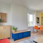 De keuken is uitgerust met diverse inbouwapparatuur en geeft toegang tot het balkon. Verder zijn er drie slaapkamers, een badkamer met douche, wastafel en wasmachine-aansluiting, en een separaat toilet met fontein. Extra bergruimte is beschikbaar in de afgesloten berging op de begane grond. Het appartementencomplex beschikt over een groene binnentuin die uitsluitend toegankelijk is voor bewoners. Voor de deur is het doordeweeks betaald parkeren van 06:00 tot 11:00.