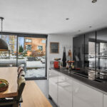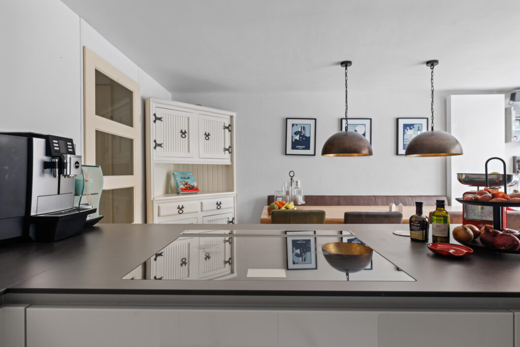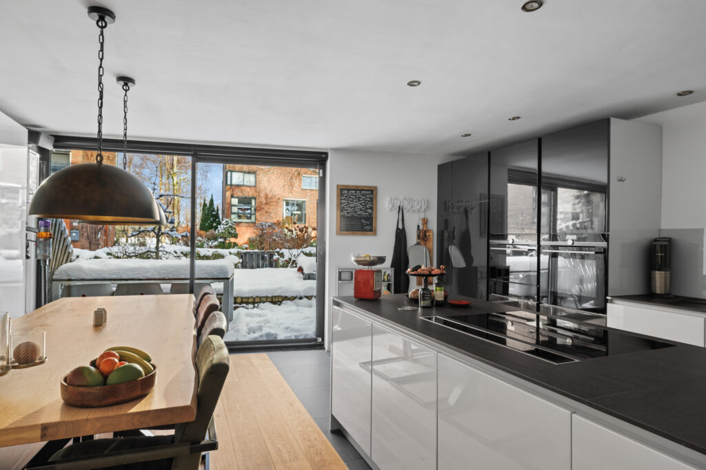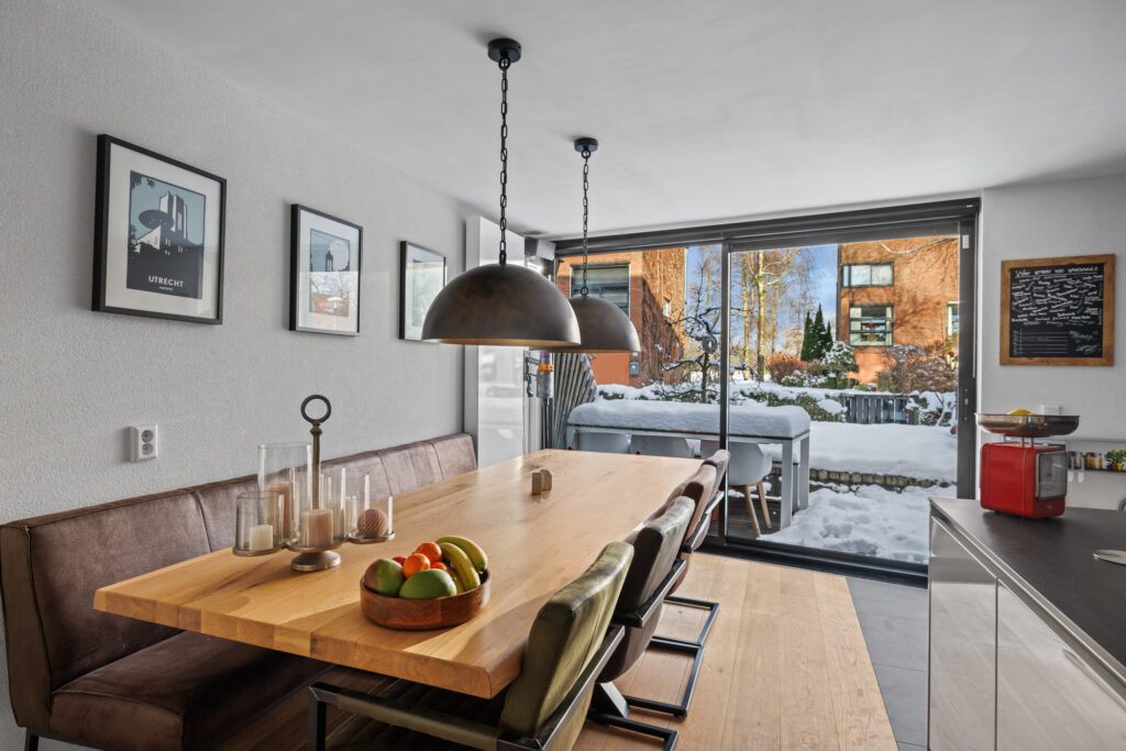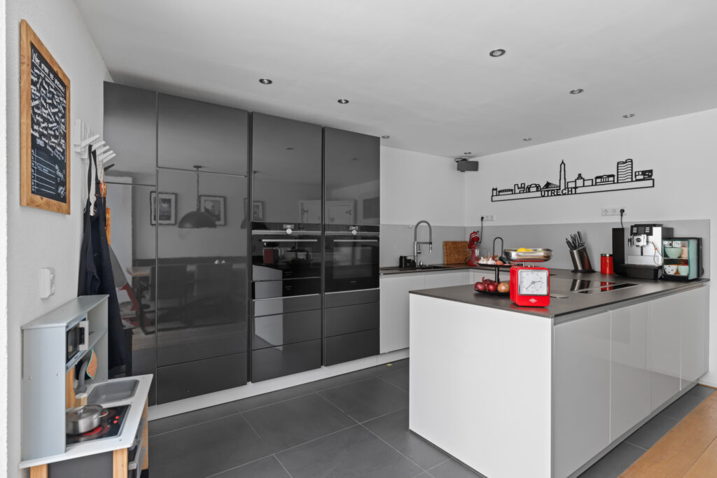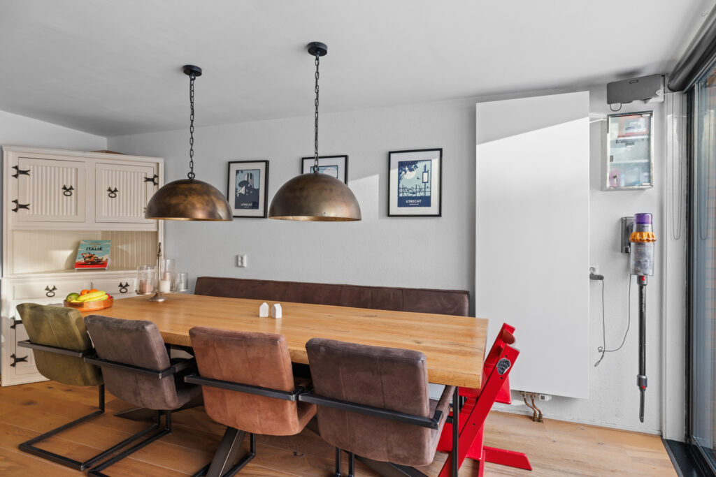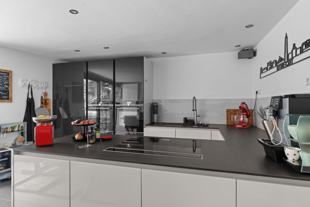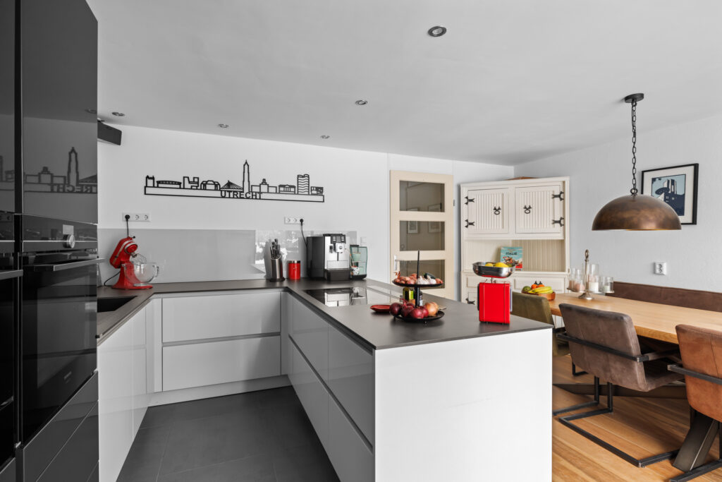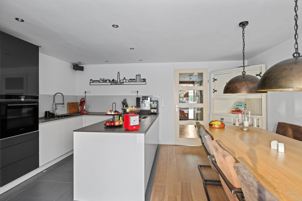 De leefkeuken ligt op de begane grond en is uitgevoerd in een U-opstelling van het luxe merk Next125: strak, tijdloos en ontworpen voor dagelijks gebruik én kookliefhebbers. Voorzien van hoogwaardige Siemens Studioline inbouwapparatuur, veel kastruimte en een keramisch werkblad dat zowel praktisch als onderhoudsvriendelijk is. De houten vloer loopt hier mooi door en versterkt het warme karakter van de ruimte. Via de brede schuifpui staat de keuken in directe verbinding met het terras en de gezamenlijke achtertuin met groen tot aan de oevers van de Vecht een plek waar binnen en buiten moeiteloos samenvloeien.