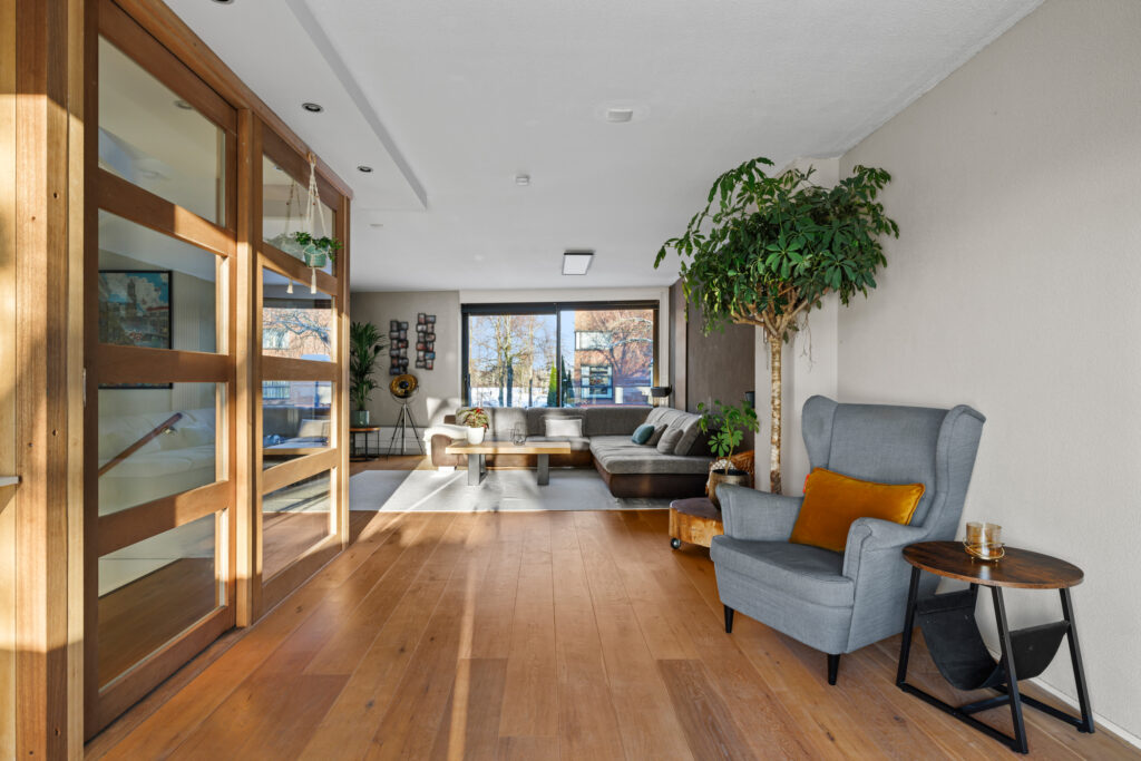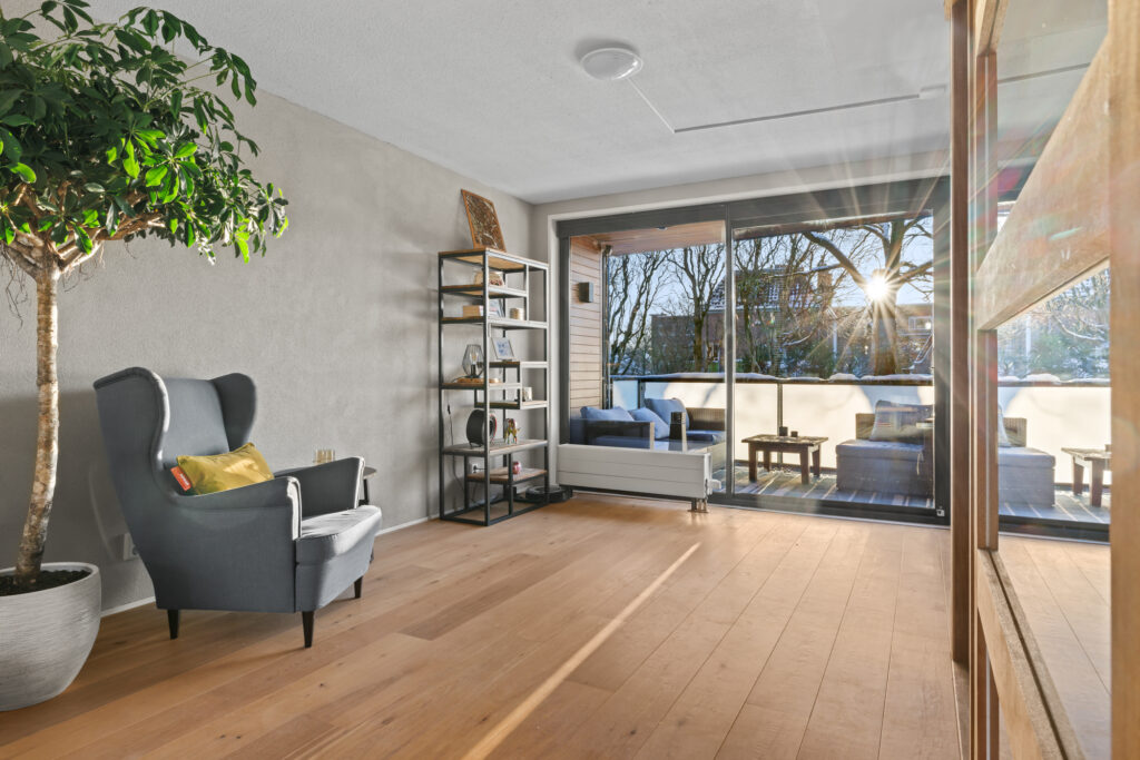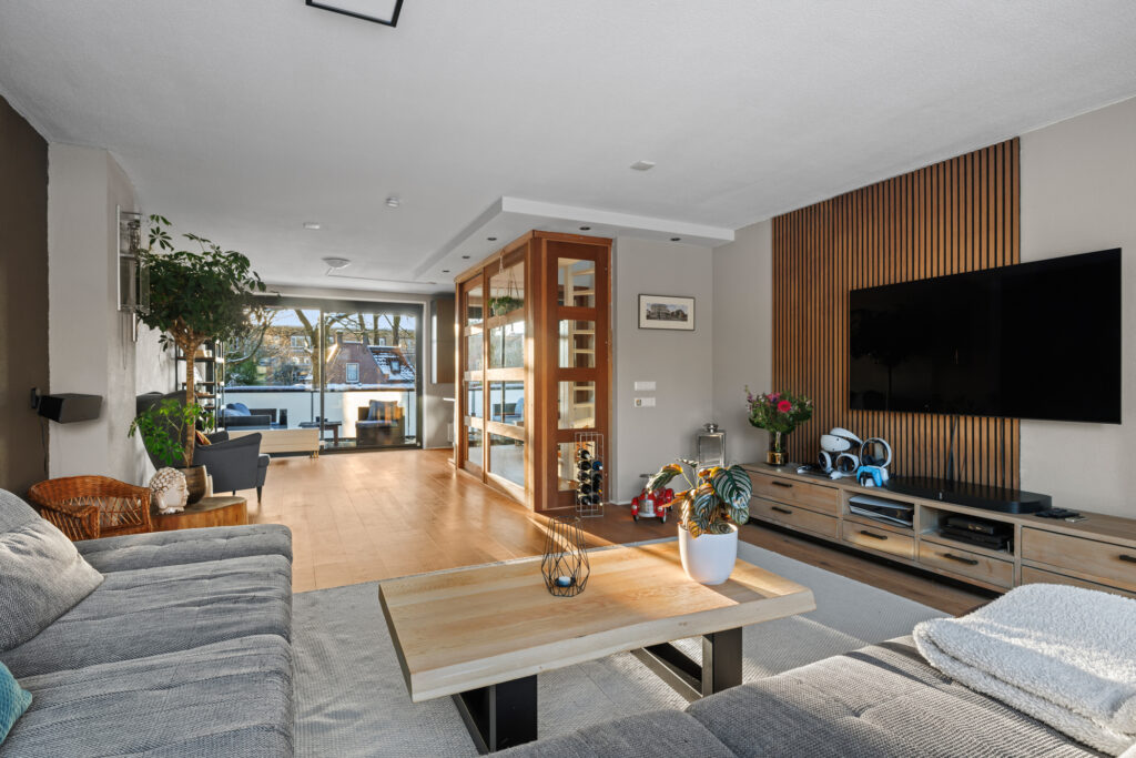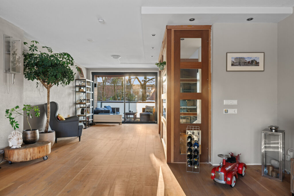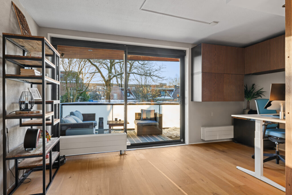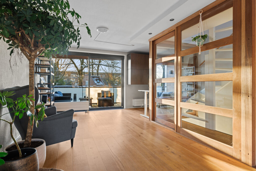 Royale woonkamer over de volledige verdieping met veel lichtinval, een warme houten vloer en vrij uitzicht. Aangrenzend een fijne werk-/studeerkamer. Aan de voorzijde het balkon met middag- en avondzon.