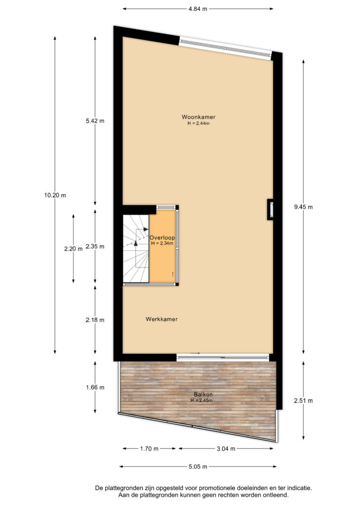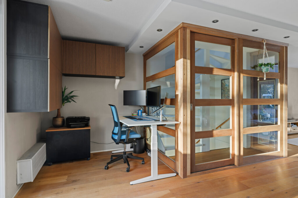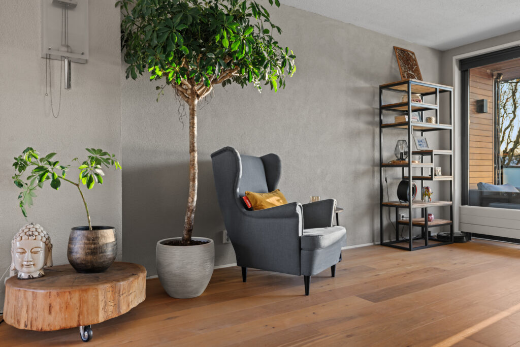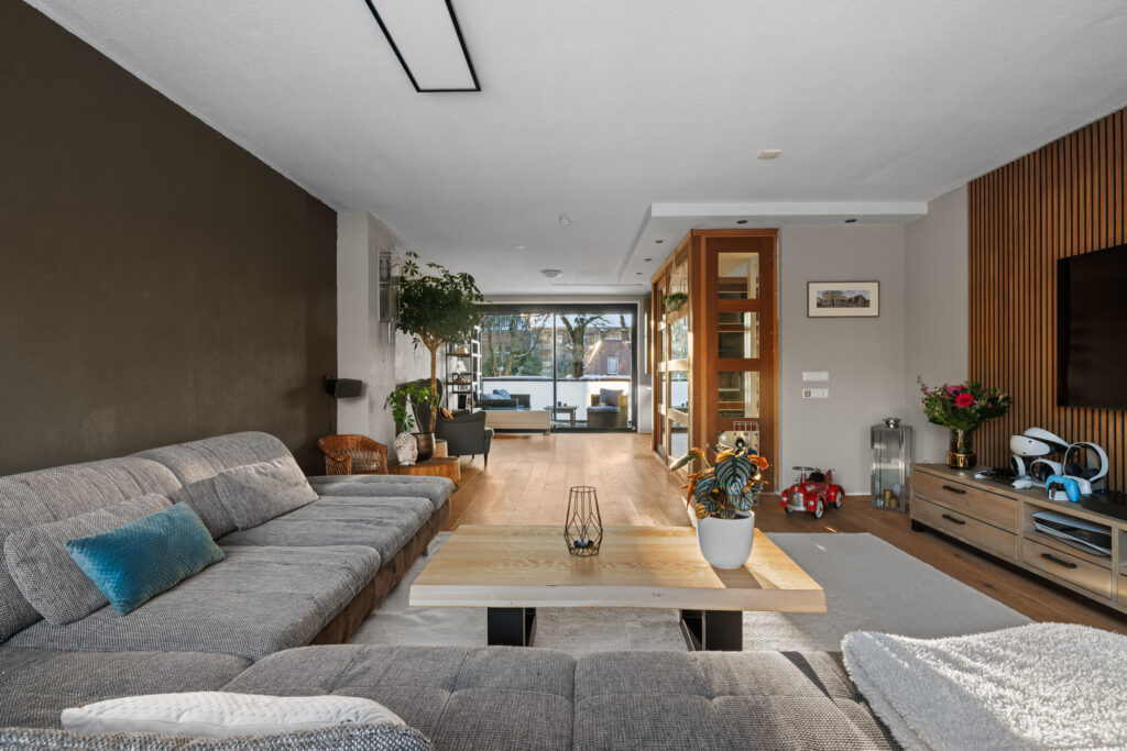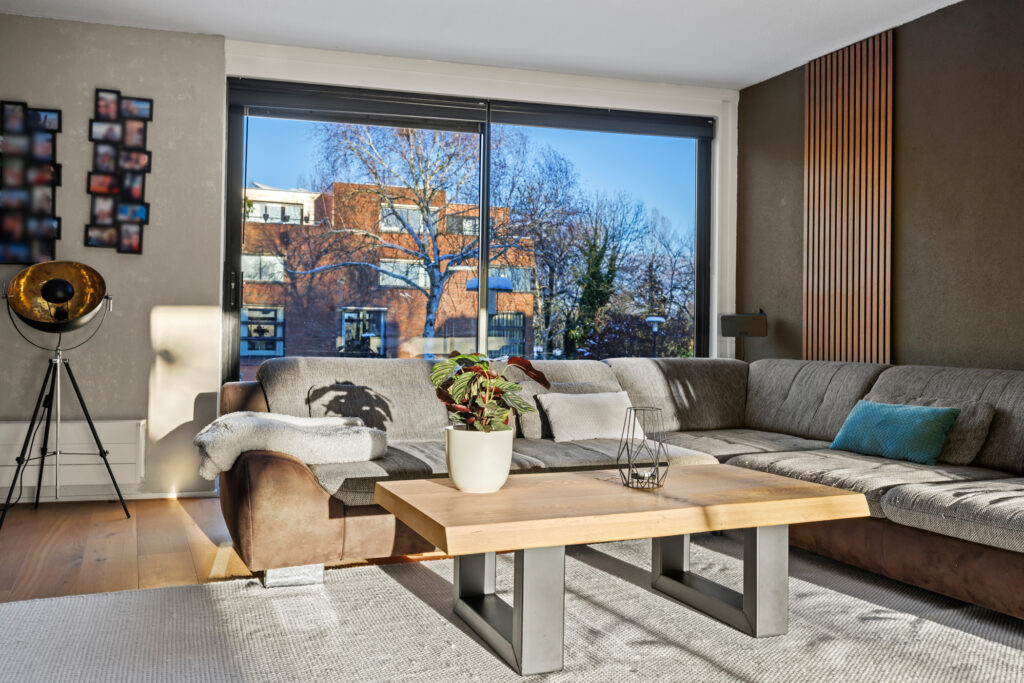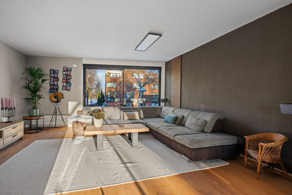 Royale woonkamer over de volledige verdieping met veel lichtinval, een warme houten vloer en vrij uitzicht. Aangrenzend een fijne werk-/studeerkamer. Aan de voorzijde het balkon met middag- en avondzon.