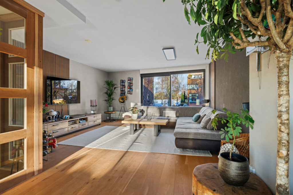 De verhoogde woonverdieping – kenmerkend voor het geliefde drive in woning – zorgt voor veel licht, privacy en vrij uitzicht. De woonkamer beslaat de volledige eerste verdieping en is dankzij grote raampartijen en schuifpuien aan zowel de voor- als achterzijde opvallend licht en ruim. Vanuit hier kijk je uit over het aangrenzende natuurgebied, waar koeien in de wei het beeld compleet maken. Inkijk vanaf de straat? Nauwelijks.