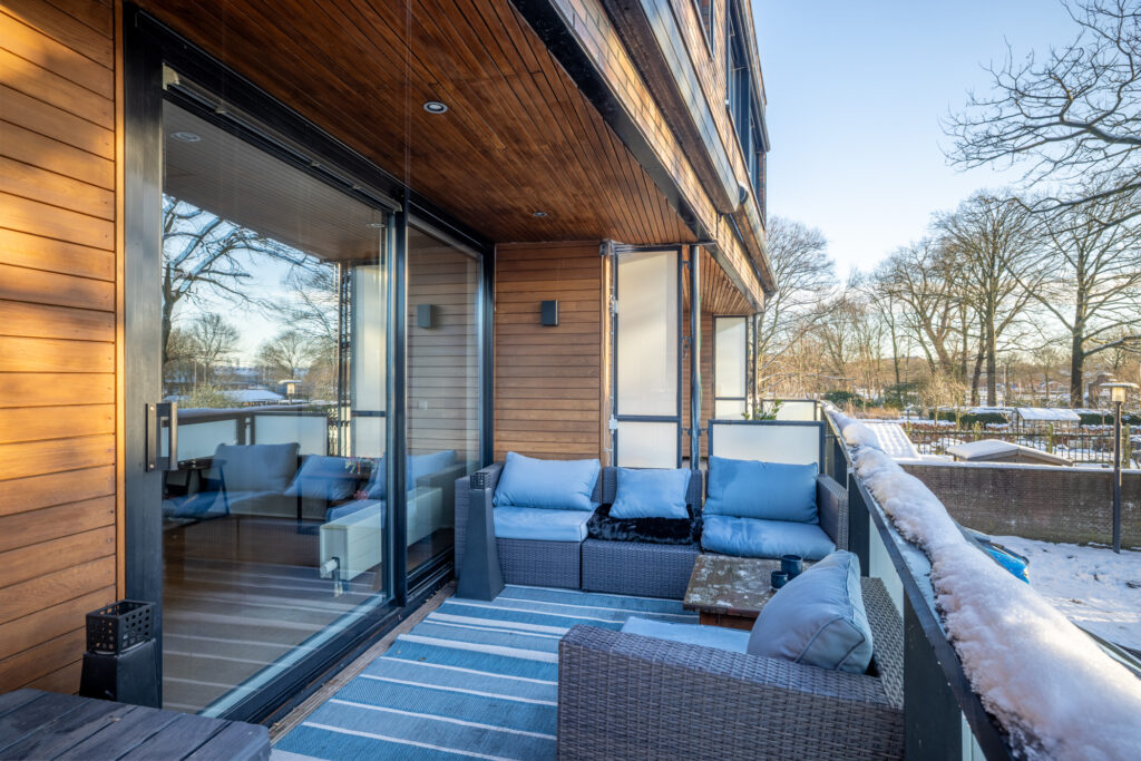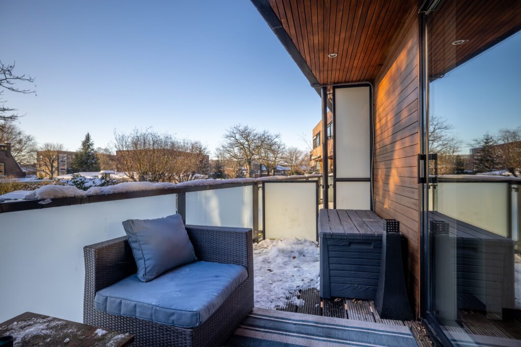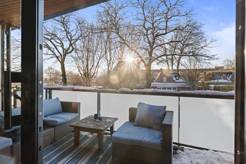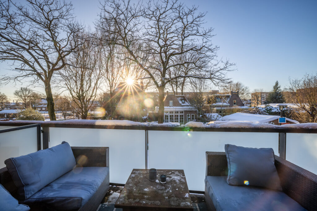 Aan de voorzijde bevindt zich het balkon, waar je vanaf de middag tot in de avond van de zon geniet. Ideaal voor een rustig koffiemoment dat moeiteloos overgaat in een borrel aan het einde van de dag.