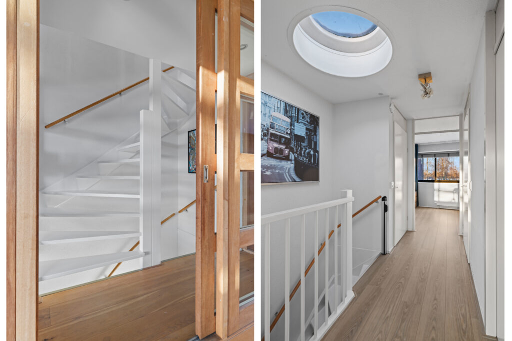 Overloop met grote daglichtkoepel en afgesloten ruimte voor de cv-opstelling. Drie slaapkamers en luxe badkamer.