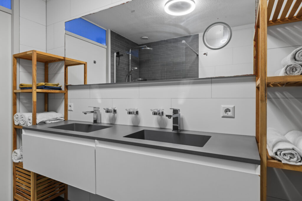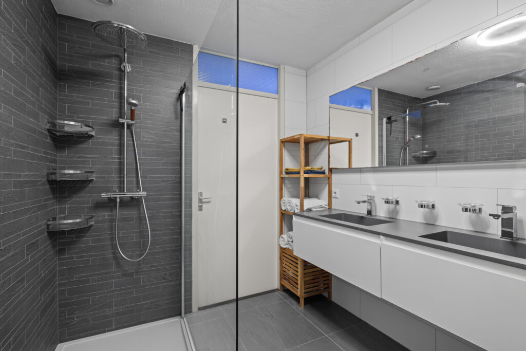 Op de tweede verdieping bevinden zich drie goed bemeten slaapkamers en een luxe afgewerkte badkamer met inloopdouche, dubbel wastafelmeubel en tweede toilet. De overloop is voorzien van een grote daglichtkoepel, wat ook hier zorgt voor een prettige lichtinval. De slaapkamers aan de voorzijde zijn uitgerust met rolluiken.