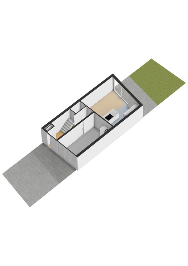 Op de begane grond bevindt zich ook de inpandige garage, direct toegankelijk vanuit de hal. Het voorste deel is praktisch ingericht als bijkeuken, met de aansluiting voor de wasmachine en droger. Het achterste deel van de garage biedt volop ruimte voor fietsen, opslag en seizoensspullen.