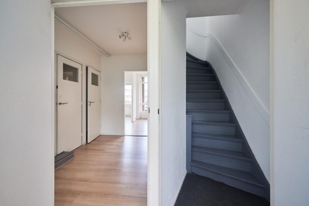 Derde verdieping: Entree met ruime hal, meterkast en toilet met fontein. Vanuit de hal is er toegang tot een interne berging met wasmachineaansluiting, een doucheruimte en een trapopgang naar de vierde verdieping.