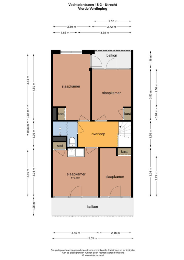 Vierde verdieping: Overloop met toegang tot alle vertrekken. Hier bevinden zich vier slaapkamers, elk voorzien van een inbouwkast en toegang tot een balkon. Eén van de kamers beschikt bovendien over een kleine keukenunit met warmwatervoorziening. De badkamer is voorzien van een douche en een tweede toilet.